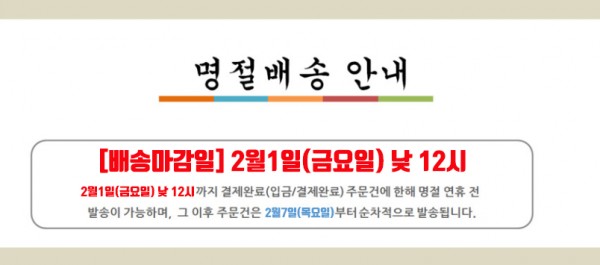 배송 | 설 명절 배송 마감 안내 입니다. 페이지 정보 작성자 깨사랑 작성일19-01-31 22:22 조회6,563회 댓글0건 관련링크 이전글 다음글 목록 본문 안녕하세요. 깨사랑 입니다. 2019년2월1일(금요일) 13시 주문건 까지는 2월1일에 발송 해드리고 그이후 주문건은 2월7일(목요일)이후 순차 발송해드립니다. 궁금하신점은 깨사랑 T 1588-8678 문의주세요 댓글목록 등록된 댓글이 없습니다. 이전글 다음글 목록